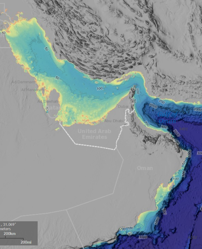 Much of the RSA is shallow, particularly in the Inner part, with depths rarely exceeding 50 meters. The Sea of Oman, by contrast, reaches depths beyond 3,000 meters and features more dynamic oceanographic processes.