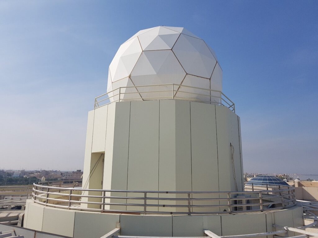 It includes X-band (7.7 – 8.5 GHz) auto-tracking 3m dish antenna (reflector) made of carbon fiber, rotator, controller, RF components, GPS antenna, X-band feed, LNA and downconverter; all housed in a protective 5.0 m x 5.5 m weatherproof radome over the top of ROPME’s new building in Granada, Kuwait.