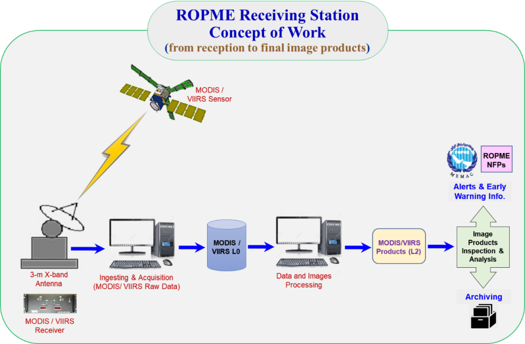 The hierarchy of work of the station starts first with reception of the real-time MODIS or VIIRS raw data through the Direct Broadcast capability of ROPME Ground Station, which then are processed in timely manner using standard methods and algorithms to higher-level data and products including quick look images, thematic maps, etc. In case of any marine incident or hazard, the remote sensing experts at ROPME issue an alert to ROPME’s Marine Emergency Mutual Aid Centre (MEMAC) and the concerned national focal point of the Member State to react and response.