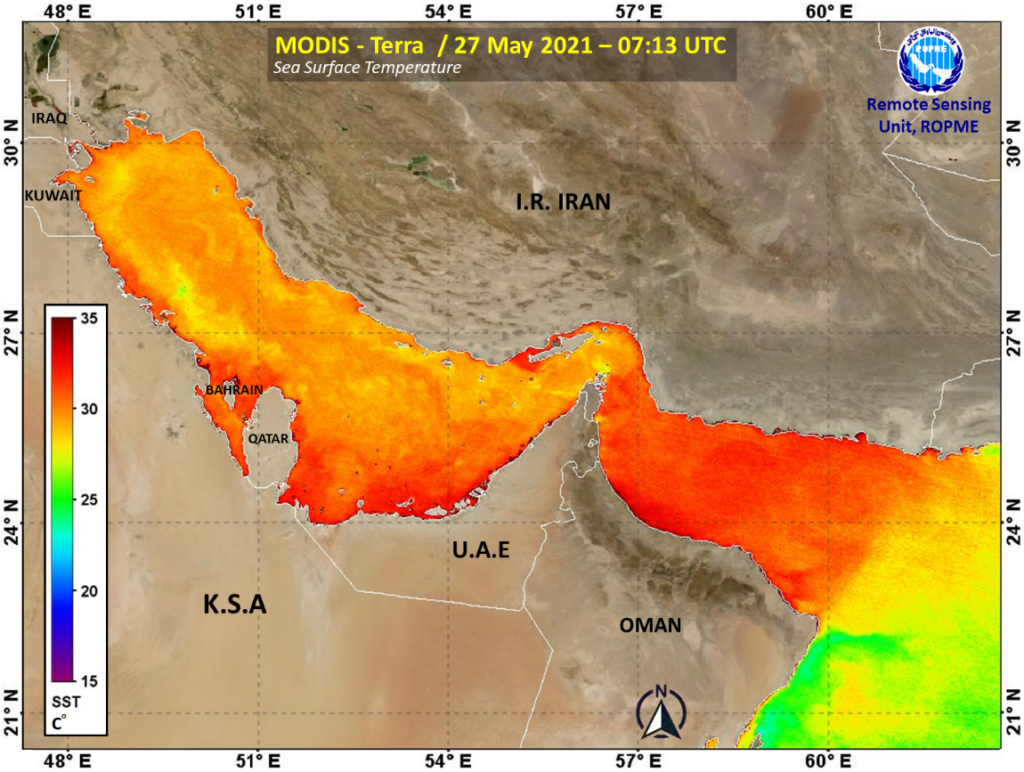 Satellite–retrieval of sea surface temperature (SST) as processed by the RSU at ROPME from MODIS-Terra data acquired on 27 May 2021