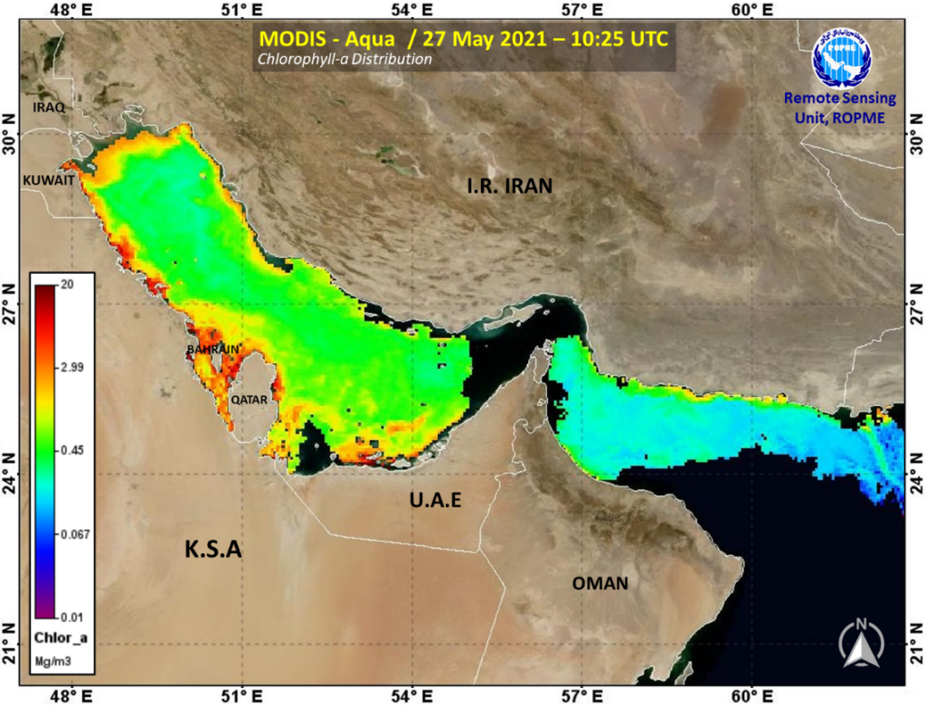 Satellite-retrieval of chlorophyll-a concentration (Chl-a) in the ROPME Sea Area, as processed by the RSU at ROPME from MODIS-Aqua data acquired on 27 May 2021