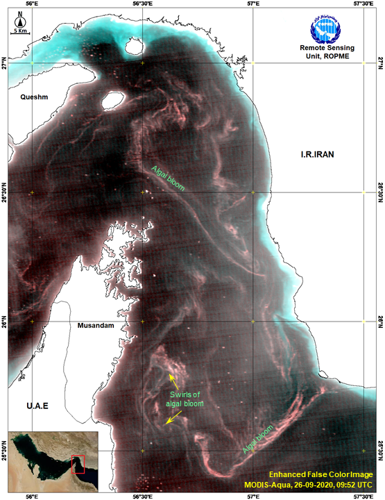 An example for one of the image final product of ROPME Station showing massive algal bloom in the Middle ROPME Sea Area sent with information alert to concerned ROPME NFPs in Iran, Oman, and UAE.
